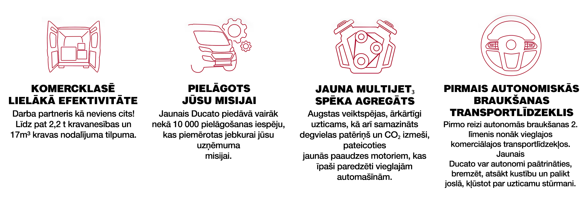 Jaunais Ducato piedāvā klasē vislabāko informācijas un izklaides programmu kopā ar jaunākajām savienojamības tehnoloģijām, uzlabojot gan transportlīdzekļu, gan autoparka efektivitāti.